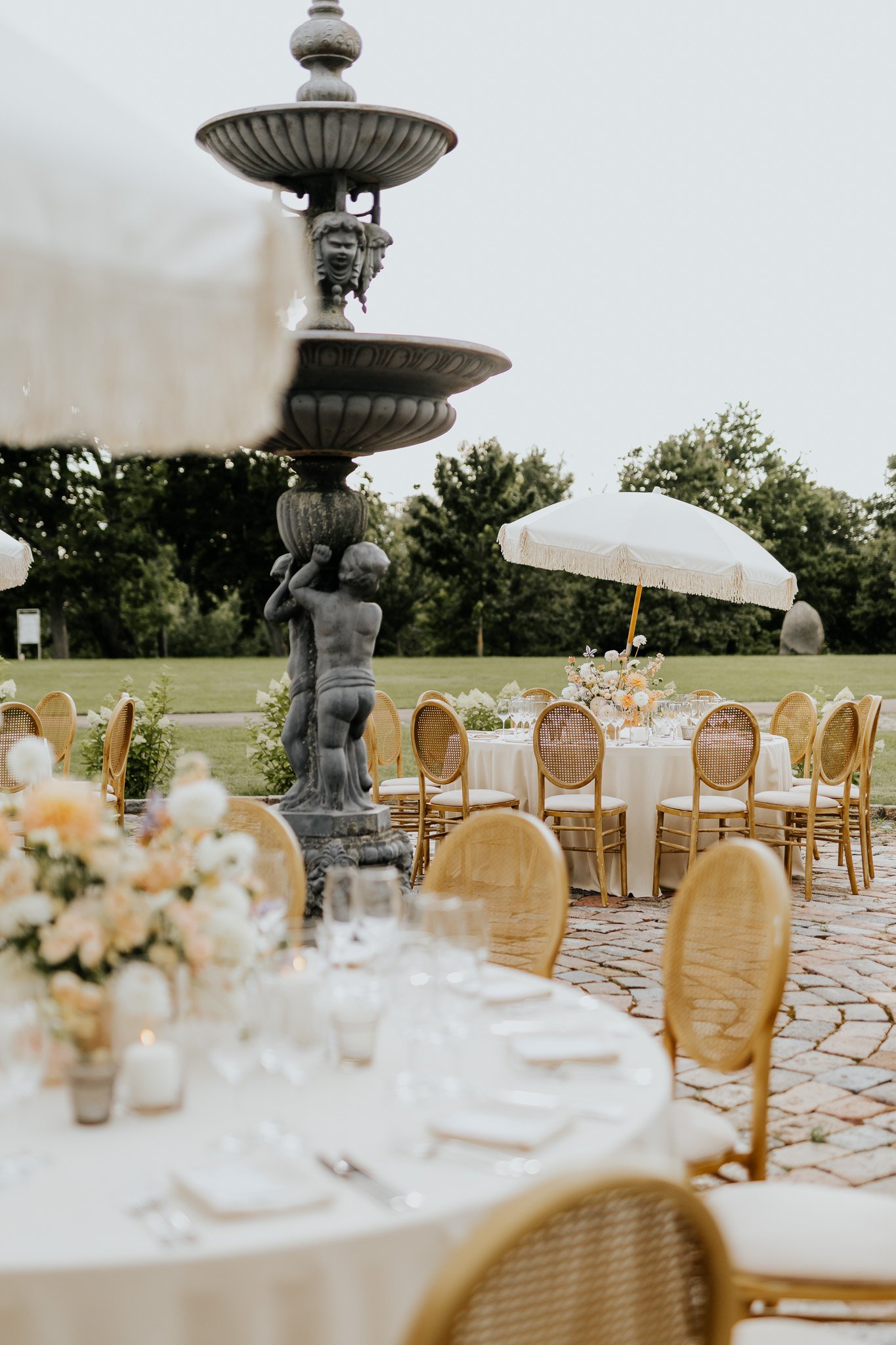 Šiltais vasaros vakarais vakarienę svečiams tiekiame po atviru dangumi, akmenimis grįstoje dvaro paradinėje aikštėje. Pokylių salė tokiu atveju tampa atskira šventės zona – šokių aikštele. Lauko erdvės dekorui panaudoti retro skėčiai puikiai papildo romantinį dvaro architektūros stilių. Dekorą kūrė: „Švenčių virtuvė“.